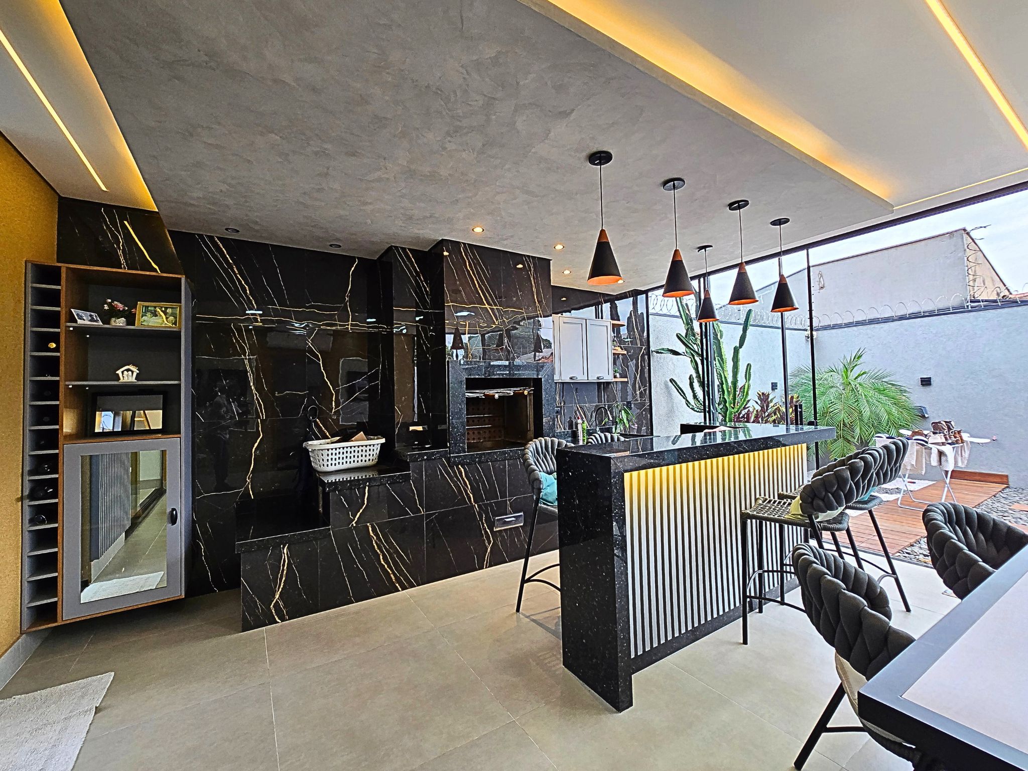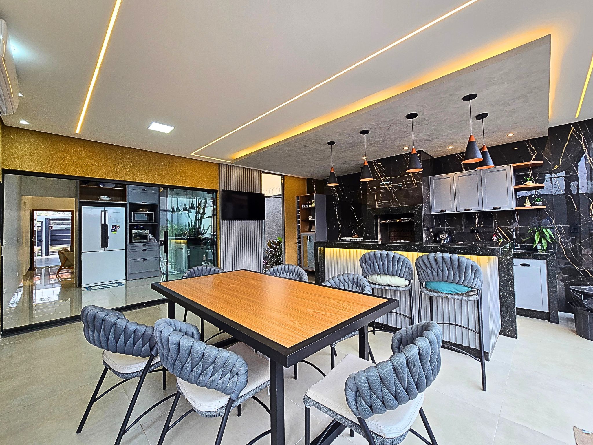 • Área gourmet ampla com planejados e fogão a lenha