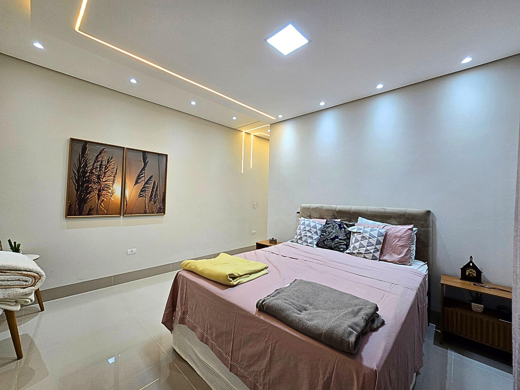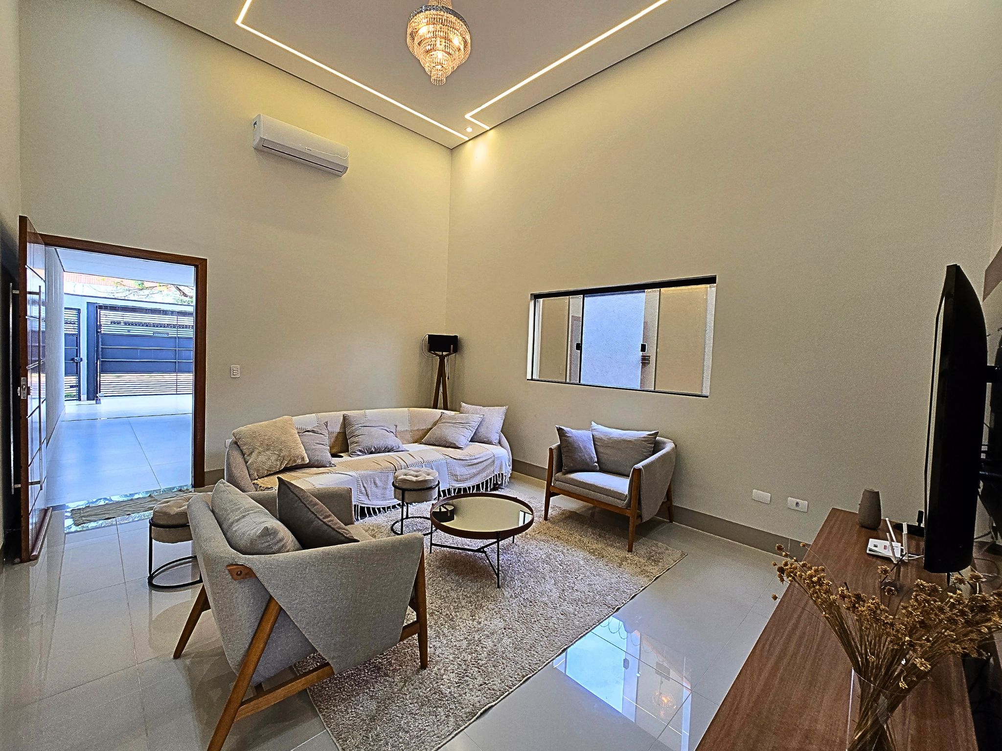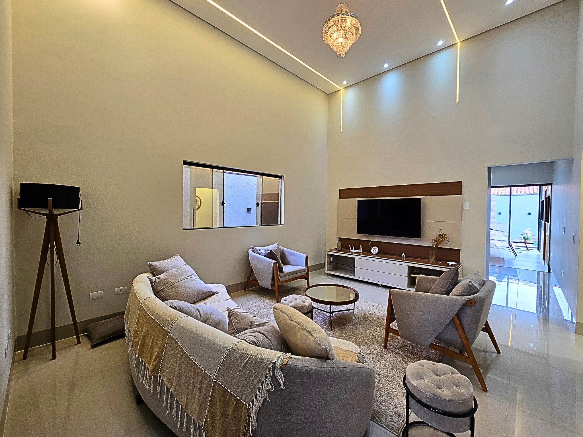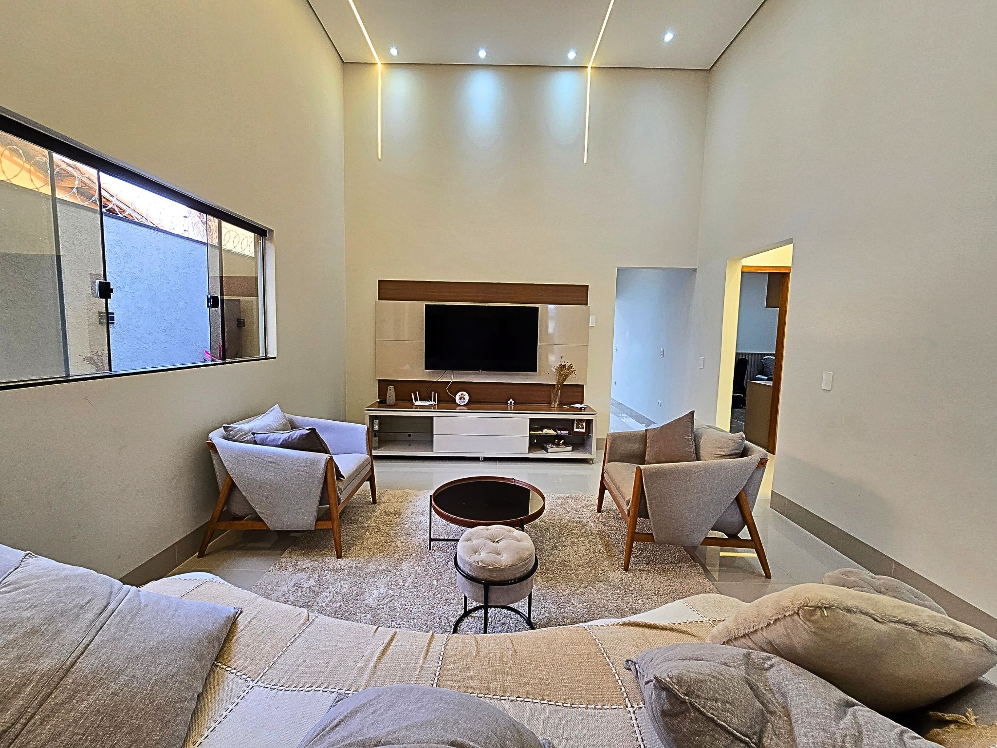 • Sala de TV com pé direito alto e painel