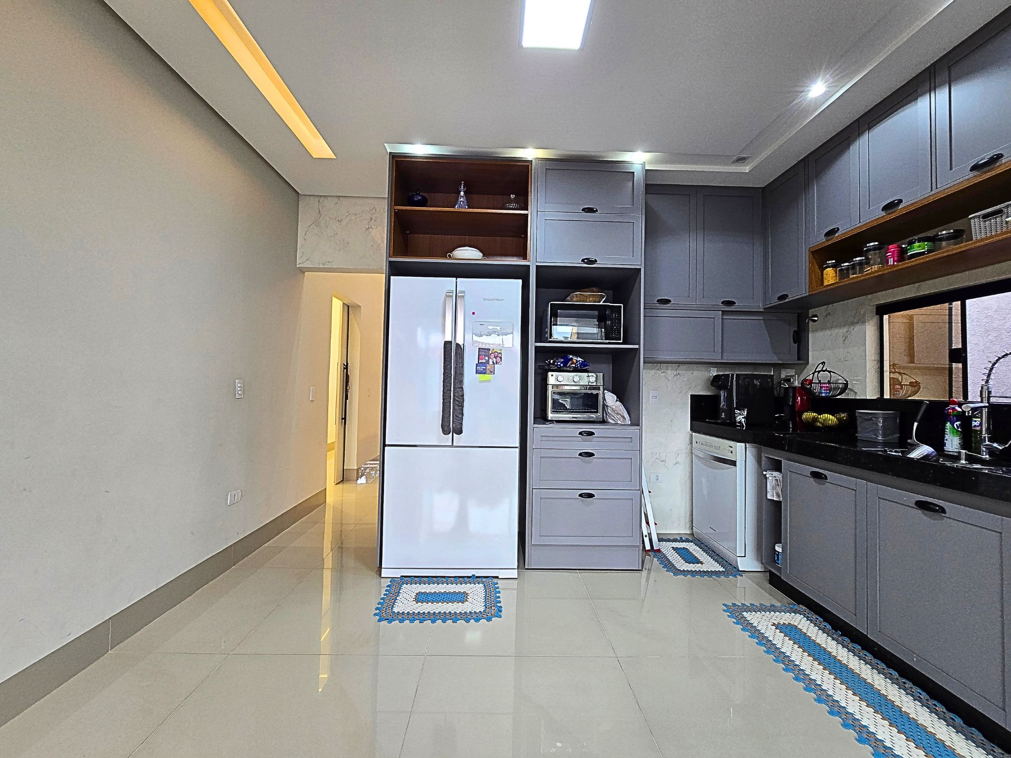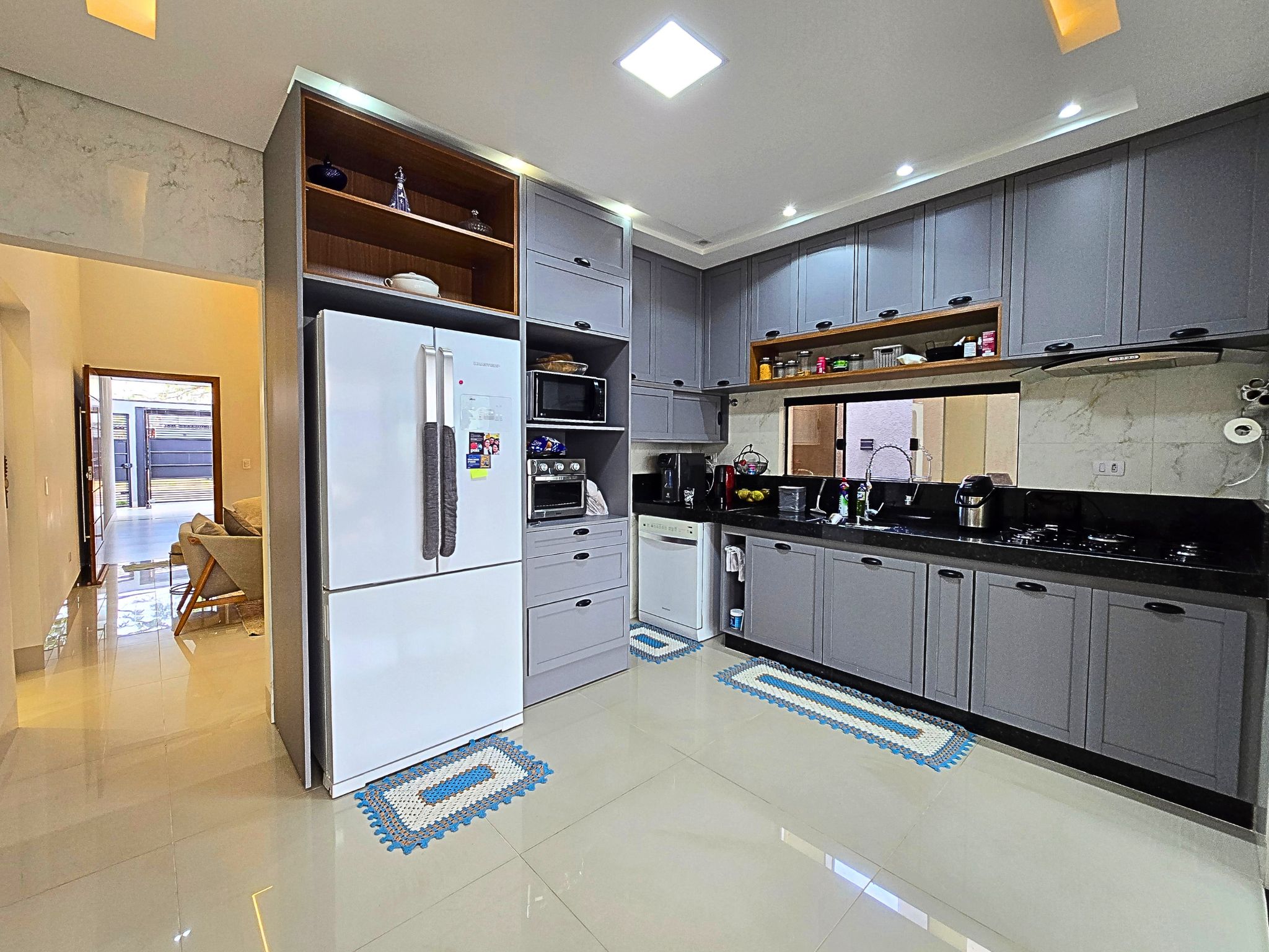 • Cozinha revestida, separada com armários planejados e cooktop